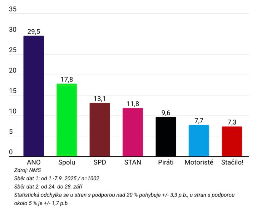 Jak widzimy na powyższym wykresie (badanie agencji NMS z września) tuż nad progiem znajdują się według badań dwa ugrupowania – Motoristé – czyli Zmotoryzowani (konserwatywna siła popierana przez byłego prezydenta V. Klausa) oraz koligacja „Stačilo!” („Wystarczyło już”, czyli zlepek partii lewicowych pod kierownictwem Komunistycznej Partii Czech i Moraw). Te dwa ugrupowania, jeżeli wejdą do parlamentu (Obecnie ich nie ma, ich posłowie zasiadają w tzw. europarlamencie), ich mandaty zostaną odliczone tym najsilniejszym w wyborach – osłabią ruch ANO oraz koalicję „Spolu” (czyli obecny rząd bez ruchu STAN). To wprowadza stan niepewności, co do ostatecznego wyniku wyborów – będzie się liczył dosłownie każdy mandat, by ktoś mógł opanować większość, czyli 101 foteli.
