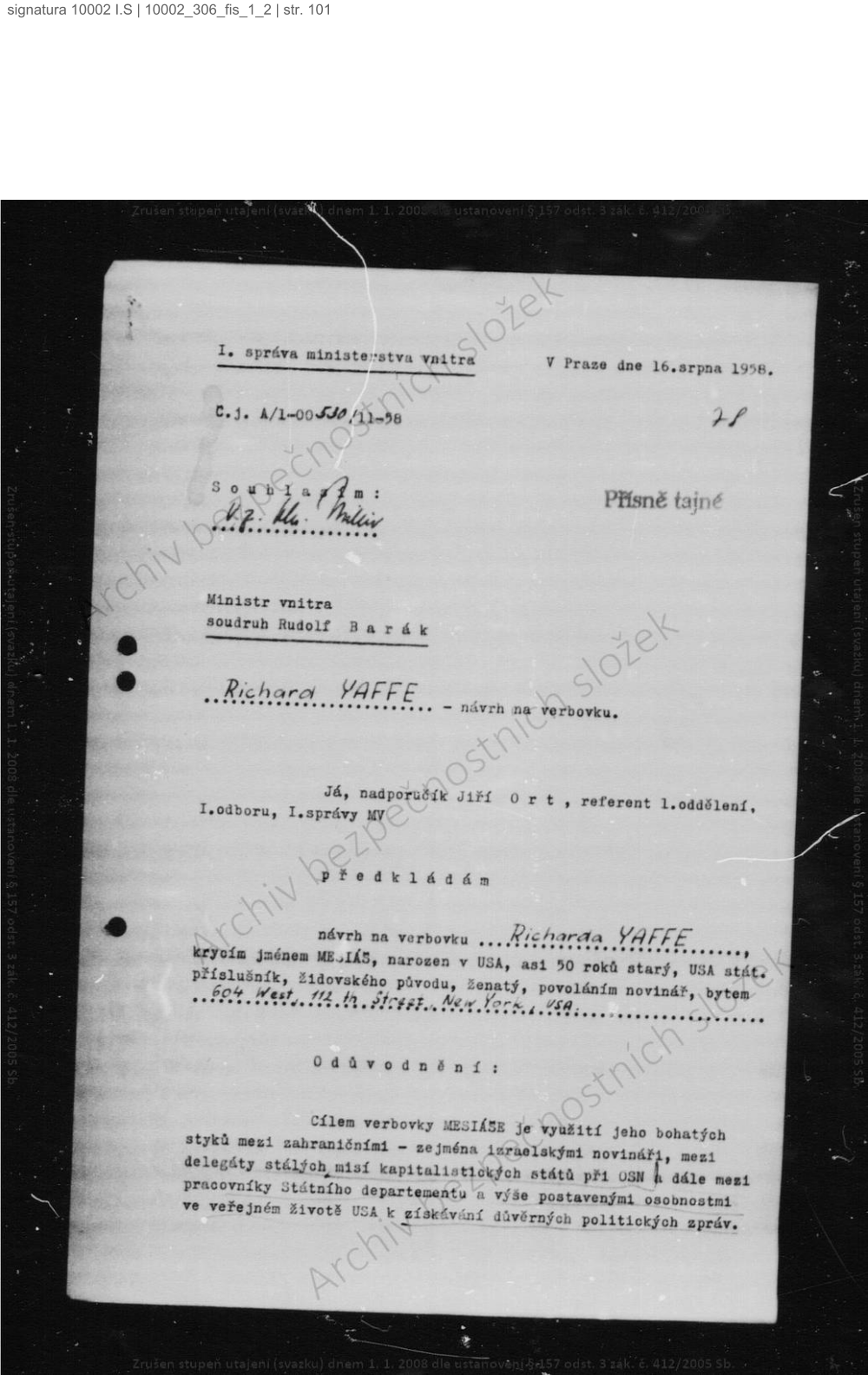 Richard Yaffee – návrh na verbovku, která byla uskutečněna 14.8. 1958