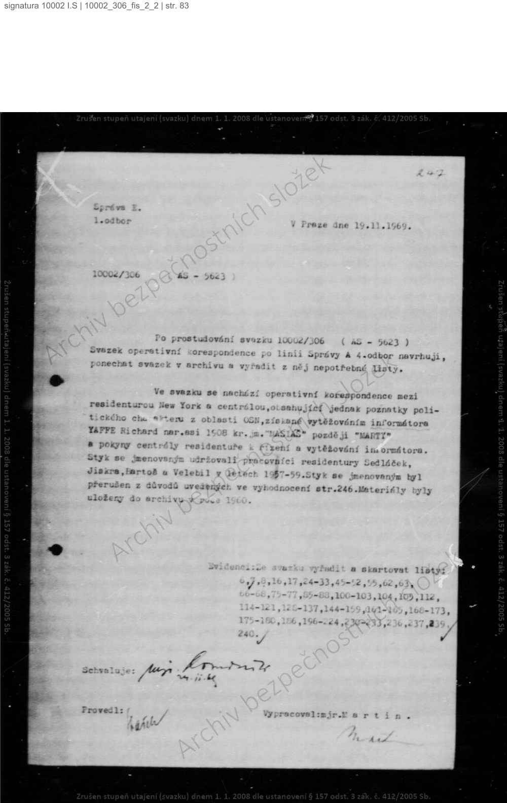 Tento případ byl rozvědkou vedeno v letech 1957 – 1960. Měnili se i řídící důstojníci, kterými byli ještě „Bartoš” (Milouš Vejvoda) a „Jiskra” (Luboš Johanis).